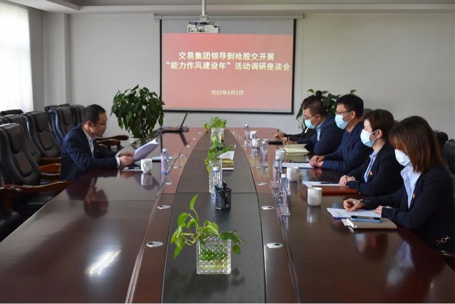 新聞中心 > 子公司動態(tài)按照交易集團(tuán)黨委關(guān)于領(lǐng)導(dǎo)班子成員深入基層黨建聯(lián)系點(diǎn)宣講省第十三次黨代會精神,深入“能力作風(fēng)建設(shè)年”活動包聯(lián)企業(yè)調(diào)研指導(dǎo)“能力作風(fēng)建設(shè)年”活動的工作部署,6月2日,交易集團(tuán)黨委委員、董秘徐松之到哈爾濱股權(quán)交易中心(以下簡稱哈股交)組織召開調(diào)研座談會,現(xiàn)場宣講省第十三次黨代會精神,就哈股交開展“能力作風(fēng)建設(shè)年”活動和支部黨建等工作情況聽取工作匯報,與哈股交中層以上管理人員進(jìn)行座談交流。
