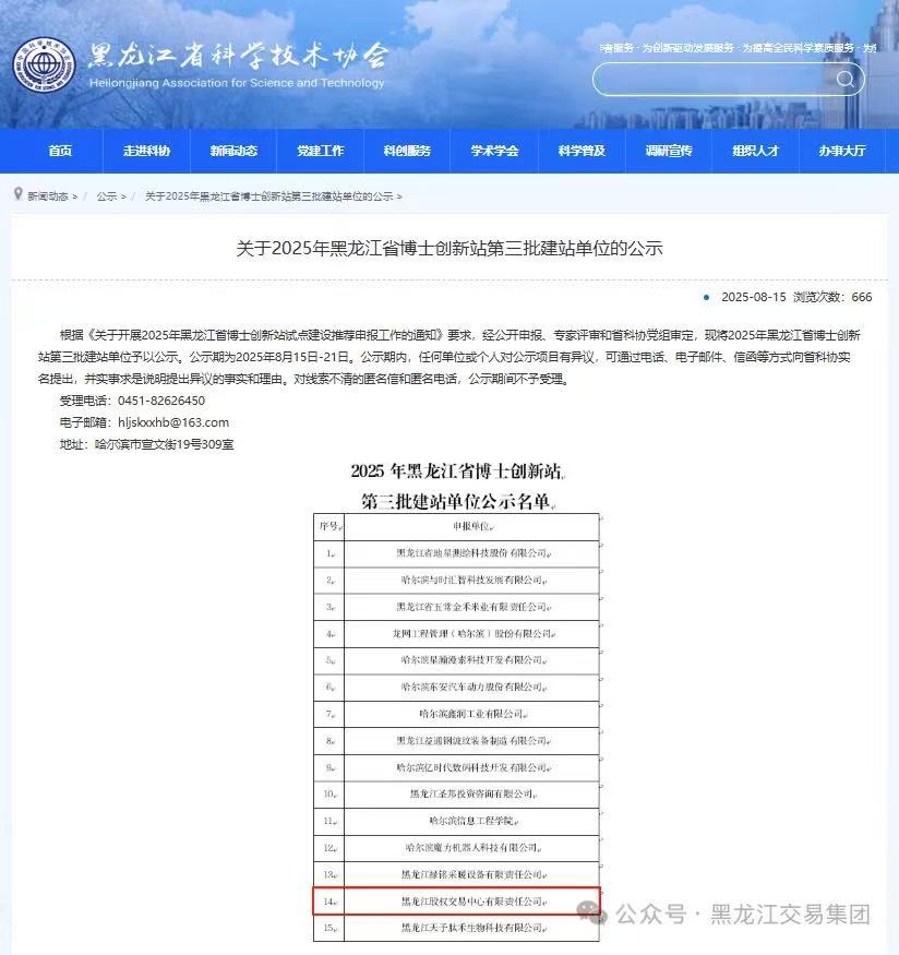 新聞中心 > 子公司動態(tài)黑龍江省科學(xué)技術(shù)協(xié)會、黑龍江省工商業(yè)聯(lián)合會、共青團黑龍江省委員會聯(lián)合發(fā)布通知,公布2025年黑龍江省博士創(chuàng)新站第三批建站單位名單。黑龍江股權(quán)交易中心憑借在服務(wù)科創(chuàng)企業(yè)、搭建資本橋梁、培育創(chuàng)新生態(tài)等領(lǐng)域的突出表現(xiàn),成功入選建站單位名單,這是對龍江股交在科技成果轉(zhuǎn)化、知識產(chǎn)權(quán)運用、資本市場服務(wù)工作的權(quán)威認可,更是對龍江股交助力“創(chuàng)新龍江”建設(shè)關(guān)鍵成效的充分肯定。