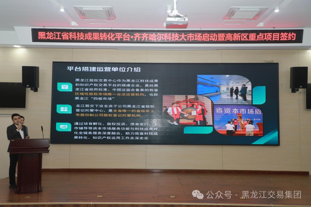 活動(dòng)現(xiàn)場(chǎng),黑龍江股權(quán)交易中心總經(jīng)理任浩對(duì)齊齊哈爾科技大市場(chǎng)建設(shè)項(xiàng)目與服務(wù)作用進(jìn)行現(xiàn)場(chǎng)宣傳推介,詳細(xì)介紹了黑龍江科技成果和知識(shí)產(chǎn)權(quán)交易平臺(tái)的功能定位、齊齊哈爾科技大市場(chǎng)服務(wù)品牌和數(shù)智服務(wù)工具,重點(diǎn)分享了“科技成果孵化—企業(yè)生成培育—上市融資發(fā)展”全鏈條一體化服務(wù)體系,通過“技術(shù)市場(chǎng)+資本市場(chǎng)”雙輪驅(qū)動(dòng)模式,為齊齊哈爾地區(qū)成果轉(zhuǎn)化托管、技術(shù)掛牌交易、創(chuàng)新資源共享、融資上市賦能等提供一站式解決方案,助力成果在齊齊哈爾就地轉(zhuǎn)化,為推進(jìn)我省哈大齊自創(chuàng)區(qū)建設(shè)與全國(guó)統(tǒng)一大市場(chǎng)建設(shè)貢獻(xiàn)市場(chǎng)化平臺(tái)力量。