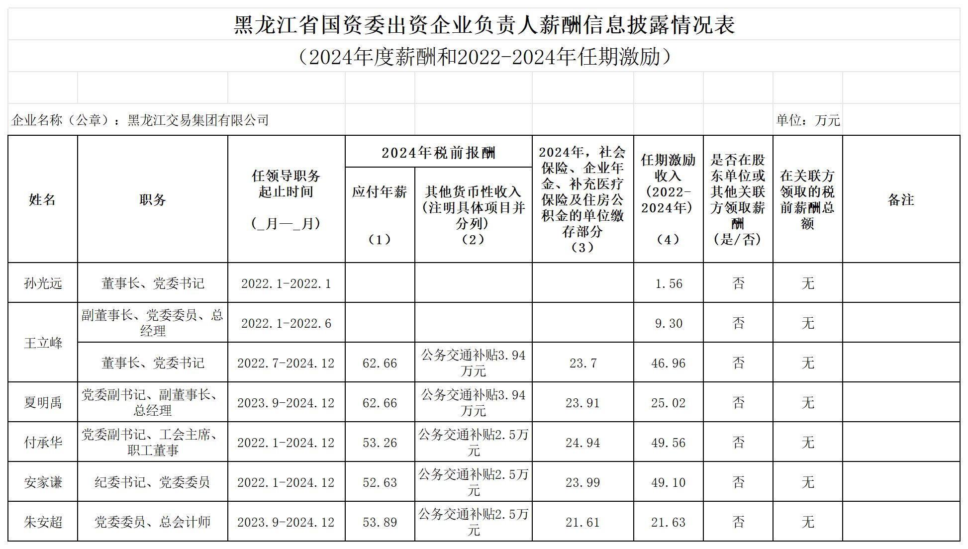 按照《黑龍江省國資委出資企業(yè)負(fù)責(zé)人薪酬管理辦法》黑國資分〔2016〕202號(hào)文件精神,黑龍江交易集團(tuán)有限公司對(duì)由省國資委管理的領(lǐng)導(dǎo)班子成員2024年度薪酬和2022-2024年任期激勵(lì)信息向社會(huì)披露如下。