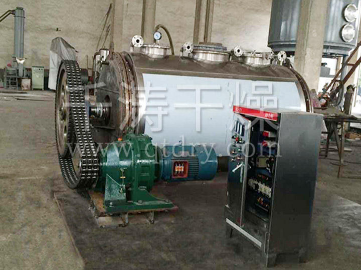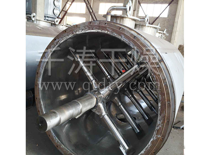 本機(jī)是一種新穎臥式間歇式真空干燥設(shè)備,濕物料經(jīng)傳導(dǎo)蒸發(fā),帶有刮板攪拌器不斷清除熱面上的物料,并在容器內(nèi)推移形成循環(huán)流,水份蒸發(fā)后由真空泵抽出。