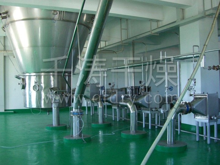 該生產(chǎn)線由供料系統(tǒng)、介質(zhì)循環(huán)系統(tǒng)、空氣加熱凈化系統(tǒng)、干燥塔系統(tǒng)、收料系統(tǒng)、控制系統(tǒng)等多個系統(tǒng)整合而成。主塔系統(tǒng)集中了目前噴霧干燥工程的技術(shù),噴干機組的收料系統(tǒng)由一級旋風分離器+布袋除塵器組合形成。一級旋風采用高氣量高效率旋風進行收集,其收粉率能達到96%左右,而布袋除塵器是針對蛋白粉類除塵專門設(shè)計的優(yōu)化設(shè)備,能使物料與風進行完全分離并沉降,布袋為拒水防油防靜電布袋,過濾目數(shù)可達500目以上。